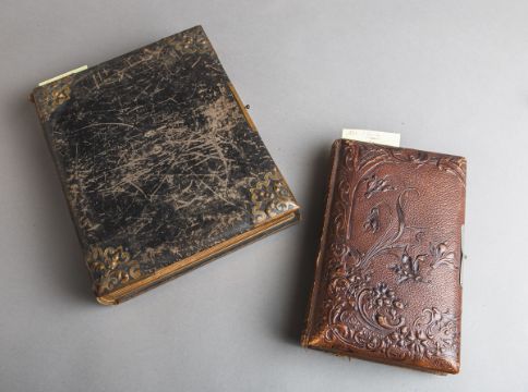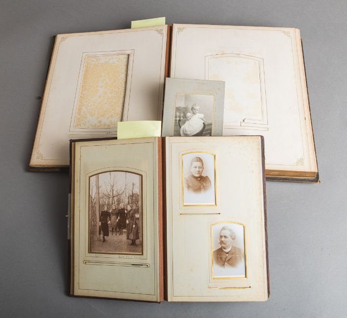 ca. 33 x 28 x 7 cm u. 1x reliefierte florale Darstellung aus der Zeit des Jugendstils, ca. 27 x 17 x 7 cm, je teilbestückt m. alten Familienfotos. Altersbed. Allgemeinzustand.