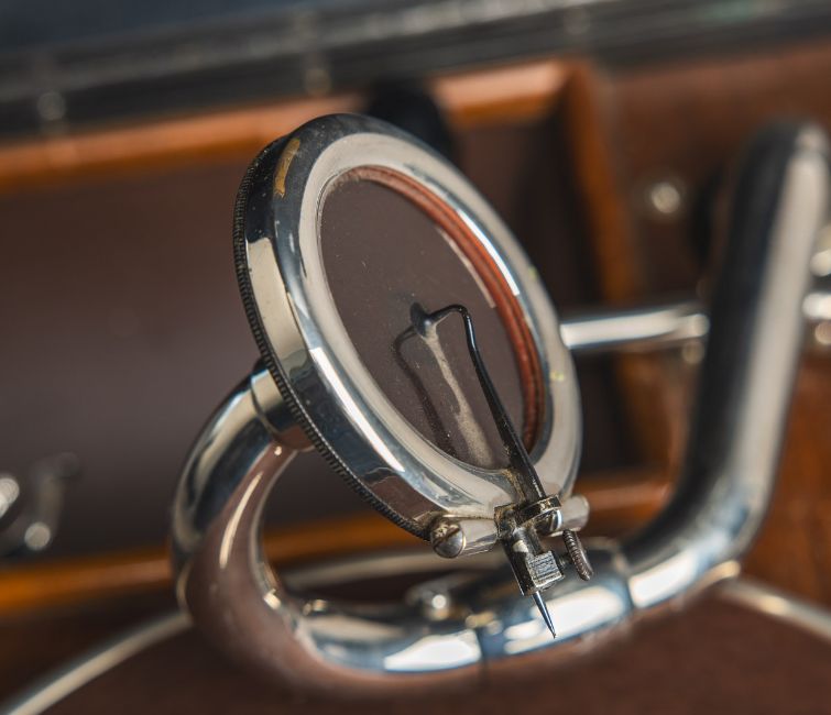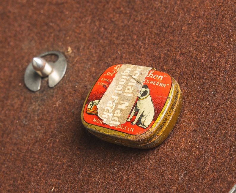 Metallbeschlägen, innen Holzgrundplatte, Plattenteller, Handkurbel, klappbarer Deckel mit innenliegendem Herst.-Etikett, Ausgelegt f. Schellackplatten (78 U/min). Alters- u. gebrauchsbedingter Zustand. Funktion geprüft.