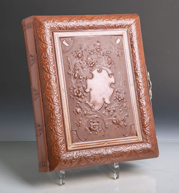 Kartuschen, in Gold gearbeitet, mit Mittelschließe, 3-seitiger Goldschnitt, 16 Seiten, Maße ca. 22 x 27 x 7 cm. Altersbed. Gebrauchszustand.