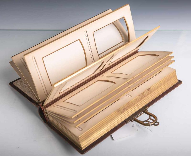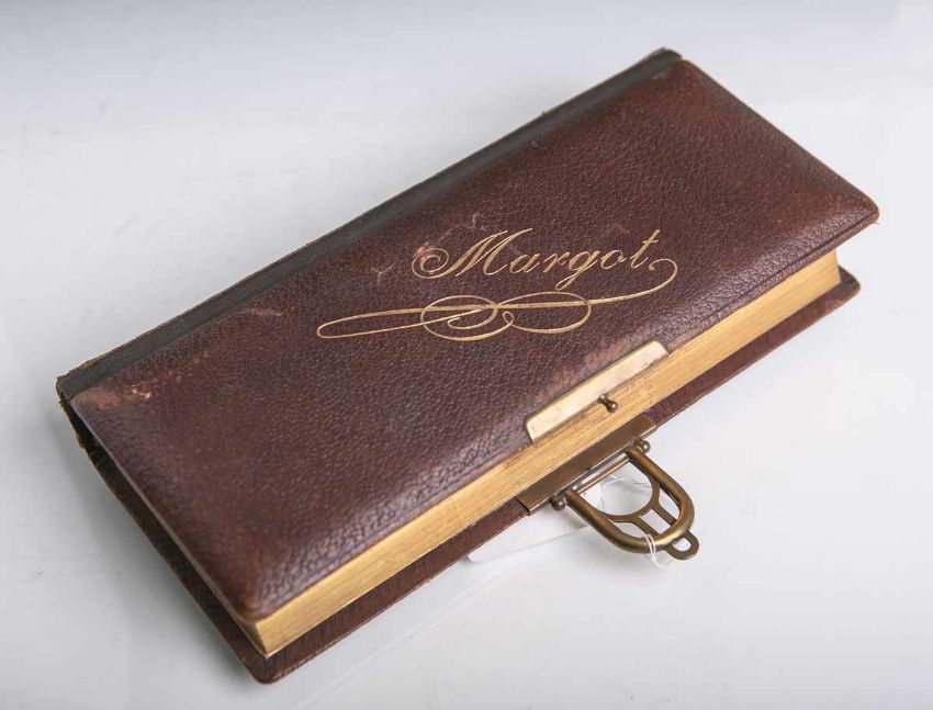 Mittelschließe, 3-seitiger Goldschnitt, auf dem Deckel in Goldschrift bez. "Margot", 14 Seiten, Maße ca. 11,5 x 25 x 6 cm. Altersbed. Gebrauchsspuren.