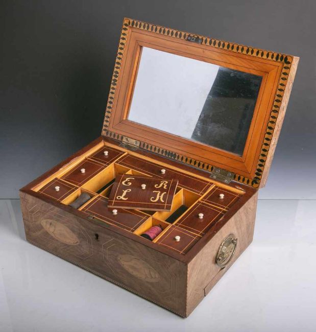 Floraldarstellungen, Griffe aus Messing, innen m. Spiegel u. 13 kl. Fächern, Initialien "EL" u. "RH", abschließbar (Schlüssel fehlt), ca. 14 x 33,5 x 23 cm. Restaurierungsbed.