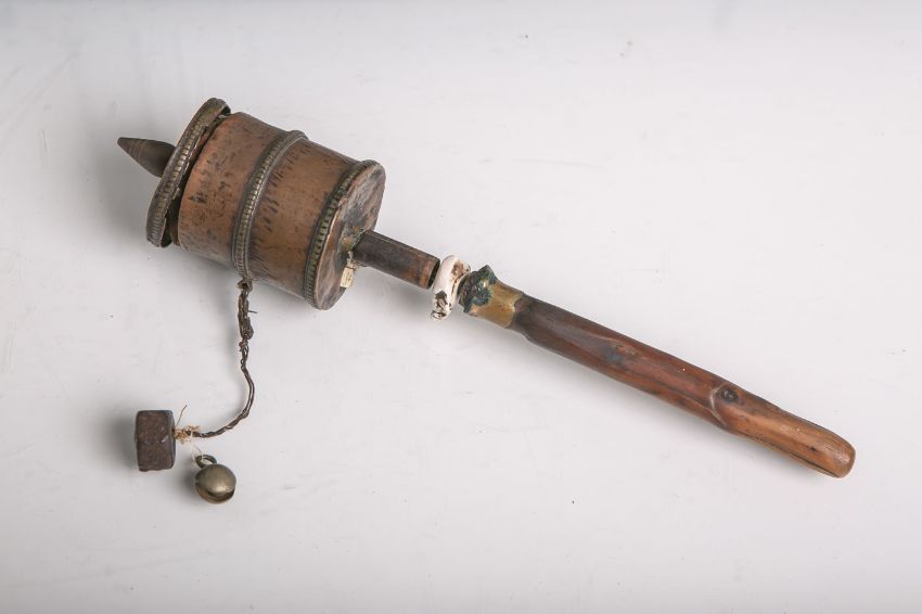 Antike Gebetsmühle aus Kupfer, Holz und anderen Materialien, innen auf Stoff gemalte