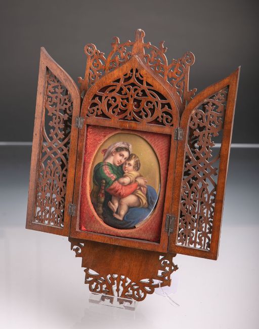 Kl. Wandaltar (1. Hälfte des 19. Jhs.), 3-flügelig, die Türen durchbrochen aus Mahagoniholz gearbeitet, mittig eine Porzellanscheibe m. Abb. v. Maria m. dem Jesusknaben, teils vergoldet, H. ca. 35 cm.