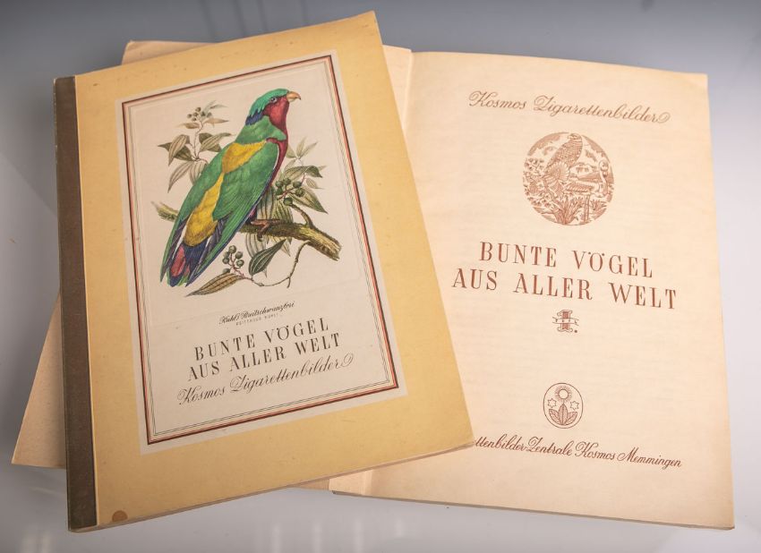 2 Kosmos-Zigarettenbilderalben "Bunte Vögel aus aller Welt", Band 1 u. 2, vollständig, ca. 31,5 x 23 cm. Geringe Gebrauchsspuren.