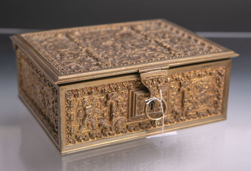 Schatulle (Historismus), Bronze/Messing m. Zedernholzinnenauskleidung, rechteckige Form, m. reichem reliefierten Dekor von Amoretten, Blatt- u. Blütenwerk, scharnierter Deckel, Unterboden gestempelt: Hersteller, Schlüssel anbei, ca. 7,5 x 20 x 15 cm.