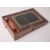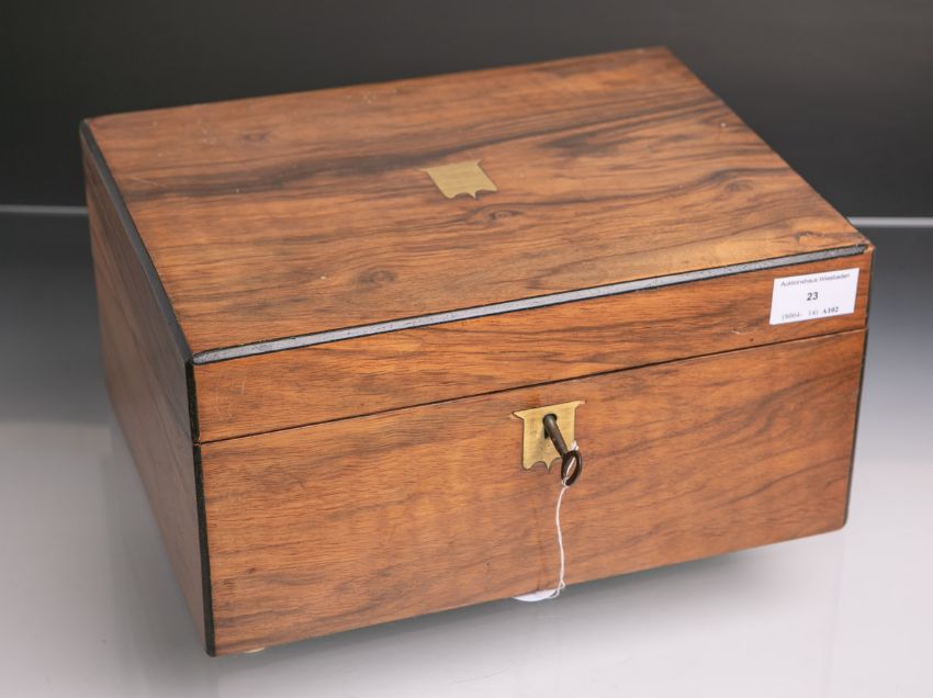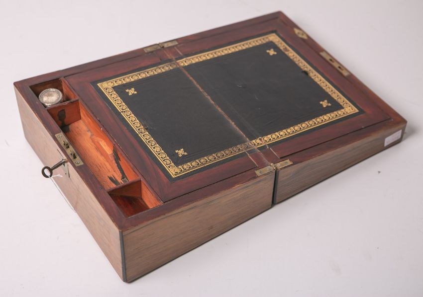 Tintenfass (gestempelt, England) u. Lederschreibauflage, abschließbar (Schlüssel anbei), ca. 15 x 29 x 23 cm. Altersgem. Zustand.