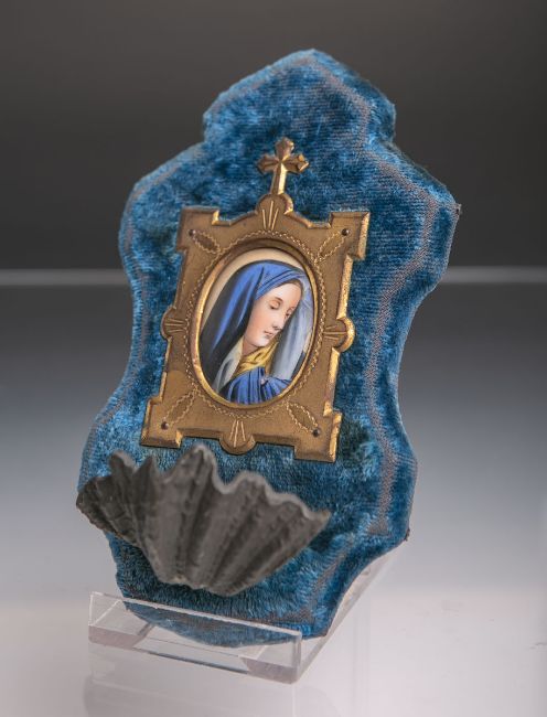 Muschel, darüber in Messingblech gearbeitete Rahmung m. auf einer Porzellanplatte bemaltes Marienbildnis, ca. 16 x 9 cm.