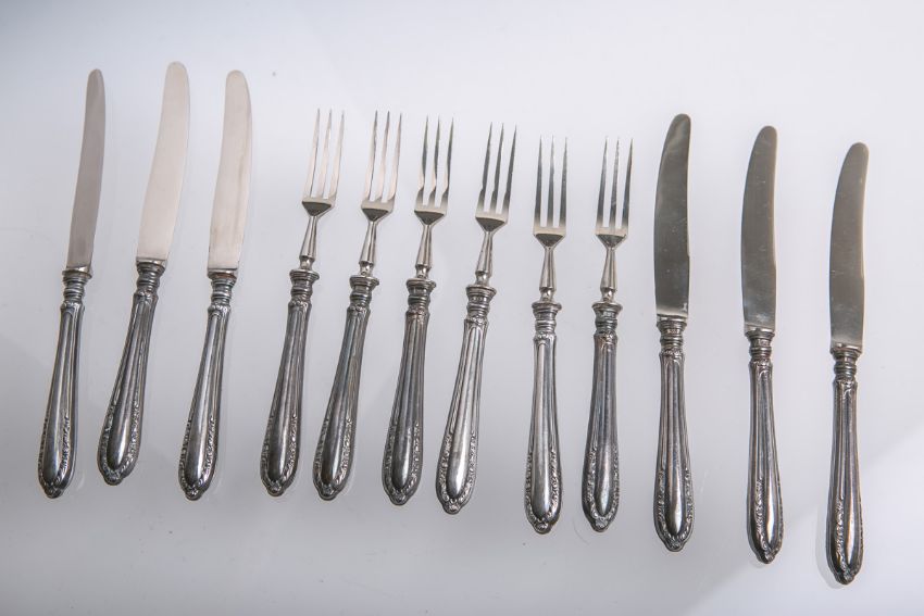 Gabeln (L. ca. 15,5 cm) u. 6x Messer (L. ca. 17,5 cm), je gestempelt: Feingehalt, Gesamtgewicht ca. 322 g.