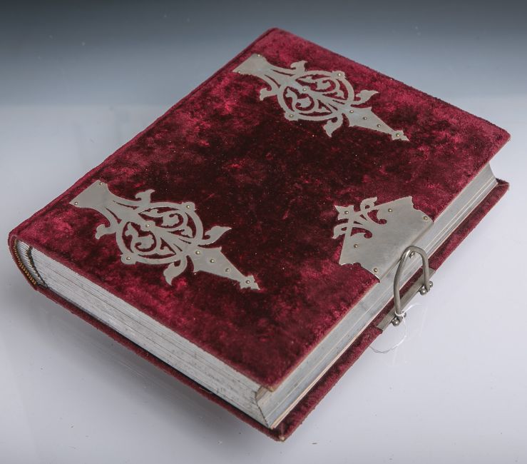 Metallverzierungen, innen 18 Seiten, 3-seitiger Silberschnitt, ohne Fotos, Zuhalterung aus Metall, ca. 6 x 22 x 27 cm. Altersgem. Gebrauchszustand.