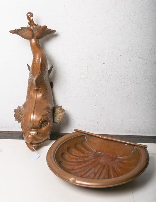 Delphins, am Kopf ein kl. Ausguss, oben an der Schwanzflosse fein verziert, Einfüllöffnung, dazu muschelförmig gearb. Kupferbecken, ca. 26 x 60 x 27 cm, Dm. (Becken) ca. 33 cm. Alte Patina.