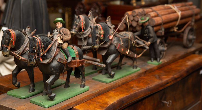 beladen, 2 Waldarbeiter, Pferde m. Lederelementen, als Basis eine Holzplatte, L. ca. 138 cm. (3010).