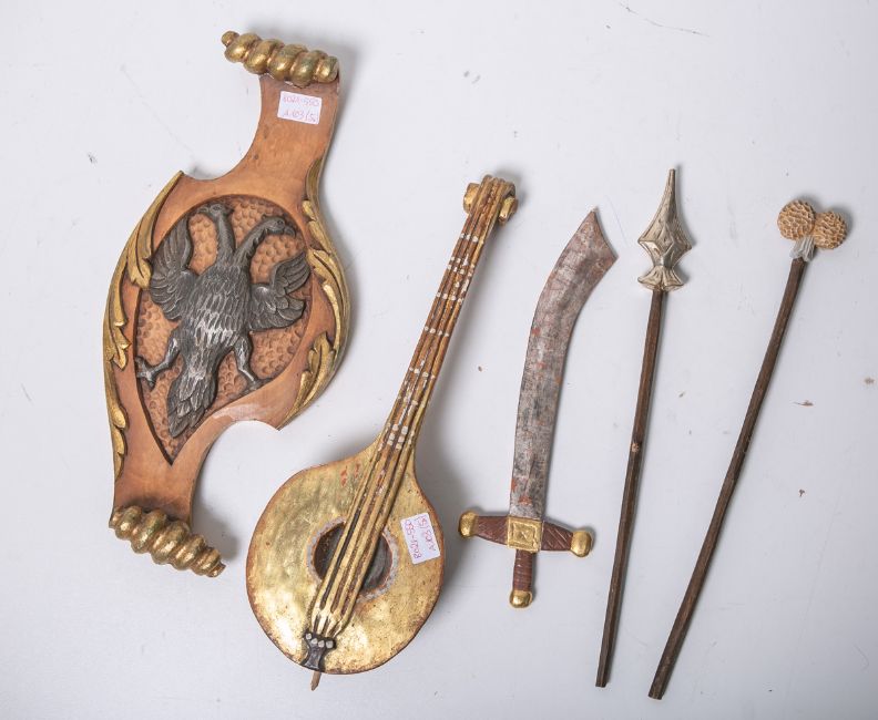 Säbel, 1x Mandoline, 1x Wappenschild, 2x Speer.