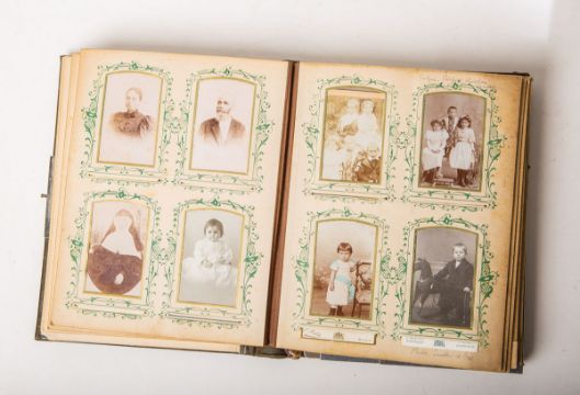 Zierprägung, 3-seitiger Goldschnitt, anbei insg. 51 private Fotoaufnahmen, ca. 27 x 20 x 7 cm. Altersbed. Gebrauchszustand, Altersspuren, Schließe fehlt.