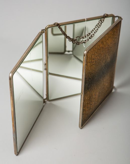Wandaufhängung, ca. 26,5 x 21 cm (im ungeöffnetem Zustand). Gebrauchsspuren, 1 Spiegelfläche gesprungen.
