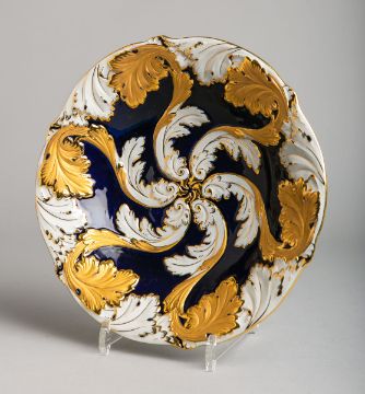 reliefiertem Akanthusblattedekor m. Goldstaffage, Pressnr.: "C 109", blaue Schwertermarke, Dm. ca. 28 cm. Goldabrieb. Versand nur durch externen Dienstleister möglich.