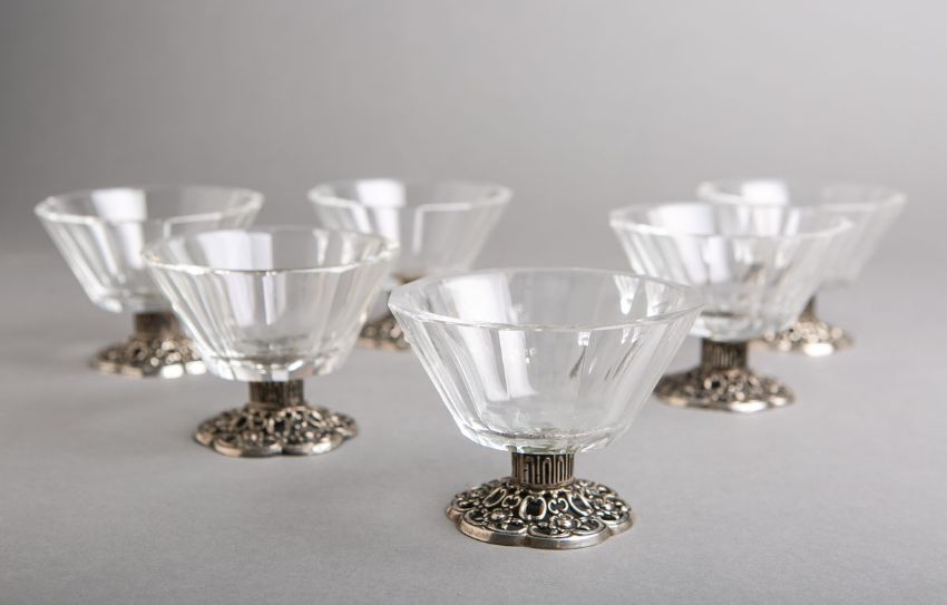 facettiert geschliffen, 835 Silberfuß durchbrochen gearbeitet, Rosen- u. Rocaillendekor, H. ca. 8,5 cm. 3 Gläser Chip.