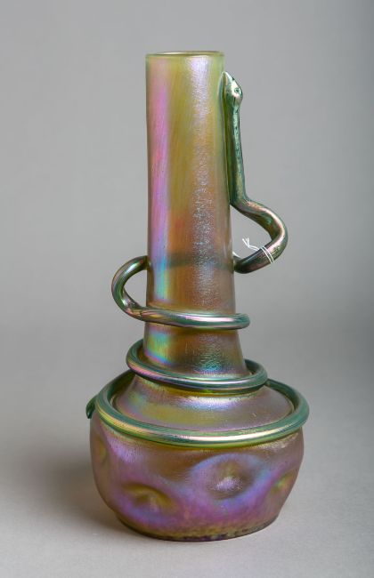 Pulveraufschmelzungen, strak irisierend, umlaufend applizierte Schlange, Abriss geschliffen, H. ca. 33 cm. Gebrauchsspuren. Versand nur durch externen Dienstleister möglich.