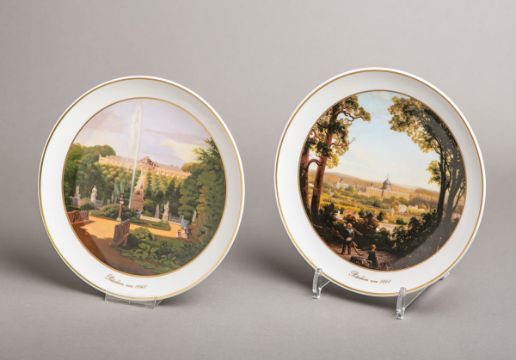 neuzeitlich), je m. Drucken des Künstlers Carl Daniel Freydanck (1811 - 1887), 1x "Das Königl. Schloß Sanssouci 1843" u. 1x "Das Neue Palais bei Potsdam vom Brauhausberge 1838", je blaue Zeptermarke, Dm. je ca. 24,5 cm.