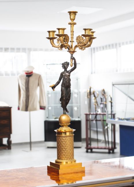 feuervergoldet, mittig figürlicher Einsatz wohl einer Bacchantin auf einer fein gravierten Säule, in der Hand d. 5-flammigen Kerzenhalter, dieser m. Weinblatt- u. Rebendekor, Sockel mehrfach getreppt, H. ca. 73 cm. Altersgem. guter Zustand. Aus Adelshaushalt.