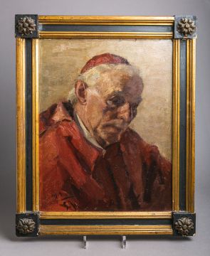 gerahmt ein Papstportrait, sign. "Hauer", dat. 1925, Öl/Karton. Altersgem. Zustand.