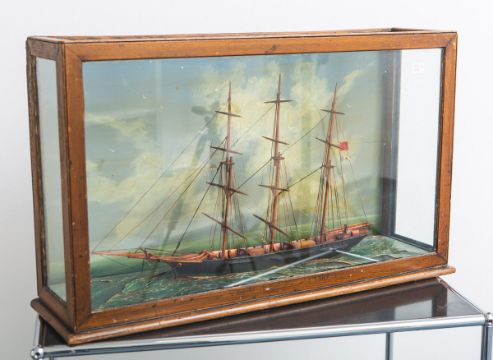 Glas in einer Holz-Schauvitrine, Gr. (Schiffsmodell) ca. L: 60 cm, Gr. (Vitrine) ca. H: 49 x B: 76,5 x T: 21 cm.