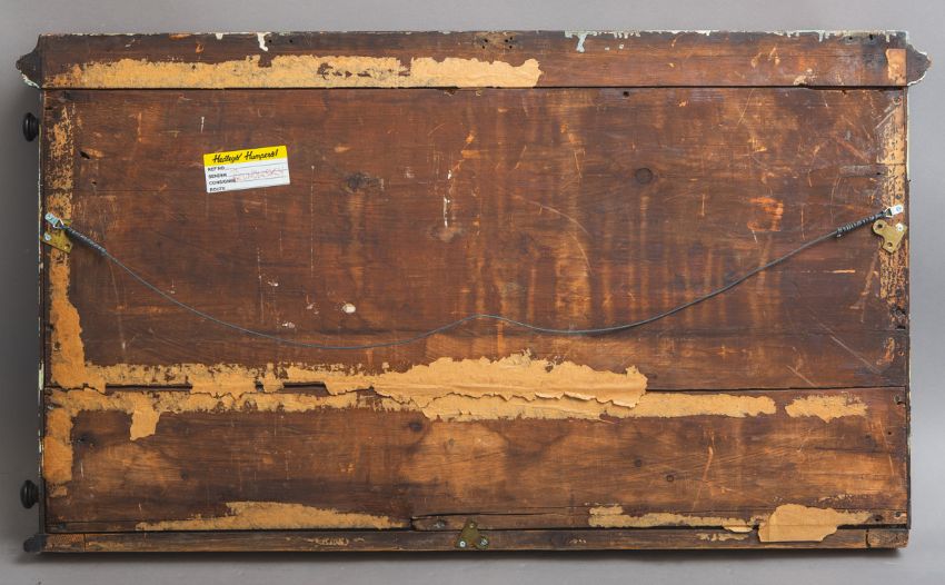 Materialien, Anzeigetafel, mittige Schreibfläche schwarzer Schiefer, Gr. ca. H: 65 x B: 113 cm.