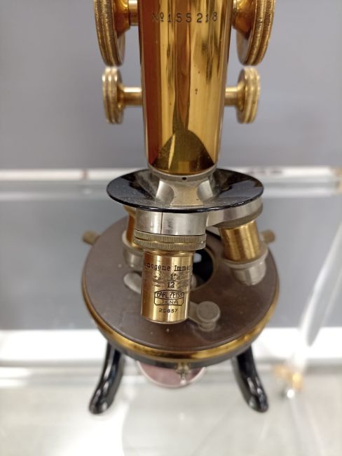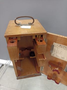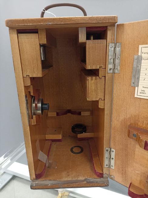Tubuslänge: 170 mm u. Bildweite: 250 mm, No. 155218, in orig. hochrechteckigem, verschließbarem Holzkasten m. Tragegriff u. Schlüssel. Sehr guter Zustand. Spiegel gesprungen.