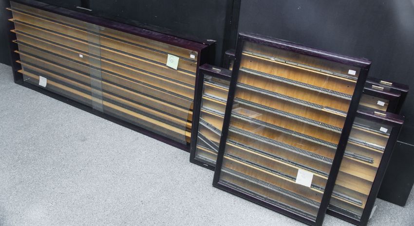ehemals für Ausstellungszwecke einer Eisenbahnsammlung, verglaste Fronten m. Einlegeböden, Gr. ca. 3x: 89 x 71 cm, 1x: 105 x 63 cm u. 2x: 170 x 71 cm. Zustand: Verweis auf Vorbesichtigung. Verpackung und Versand nicht durch das Auktionshaus möglich.