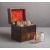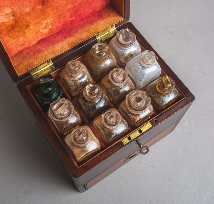 12 Glasflakons, teils m. Resten d. Inhaltes, Frontschublade m. weiterem Inhalt, Messingzier m. Griff, Gr. ca. 21,5 x 21 x 17,5 cm, Schlüssel anbei. Altersgem. guter Zustand.