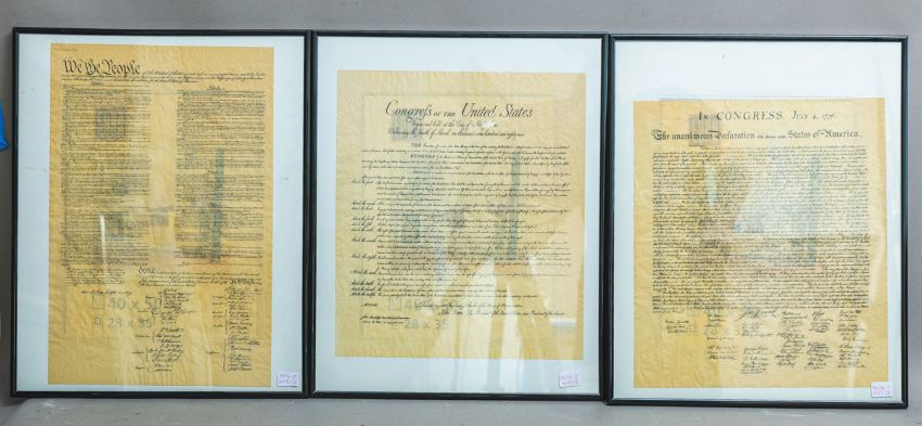 englischer Text auf 3 Blättern, dekorative Reproduktionen im historischen Stil, kein Original, ursprünglich unterzeichnet am 4. Juli 1776, Gr. je ca. 39,5 x 34,5 cm, je hinter Glas gerahmt (ca. 51 x 41 cm). Vergilbtes Papier, gute Erhaltung. Verpackung und Versand nicht durch das Auktionshaus möglich.