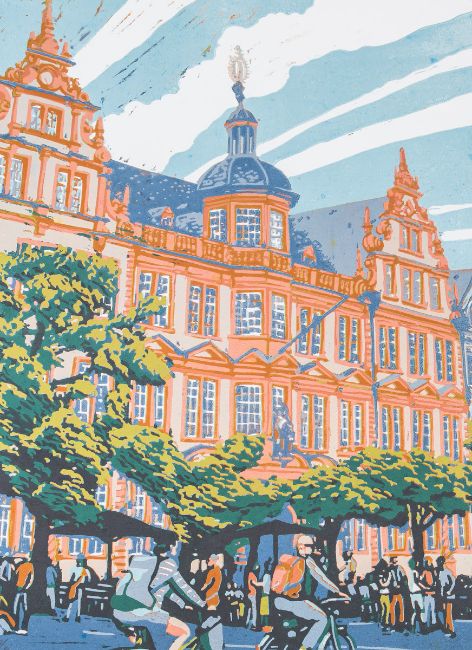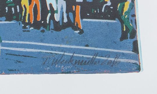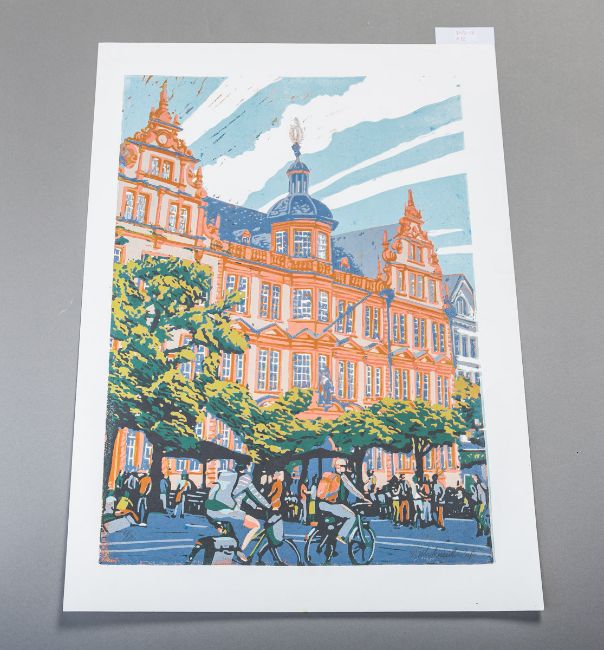 re. u. sign., numm.: 12/20, Gr. d. Darst. ca. 60,5 x 42 cm, Blattgr. ca. 70 x 50 cm. Thilo Weckmüller, 1967 in Sörgenloch geboren, ist ein Mainzer Künstler und Grafiker. Nach seinem Grafik-Design-Studium gründete er 2002 mit Thomas Bauer die Werkstatt uah! für künstlerischen Druck. Bekannt ist er für Mainz-Motive und Porträts von Widerstandskämpfern. Seit 2020 betreibt er das Kunstprojekt "Die Vitrine" in Mainz.