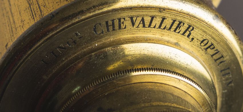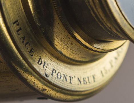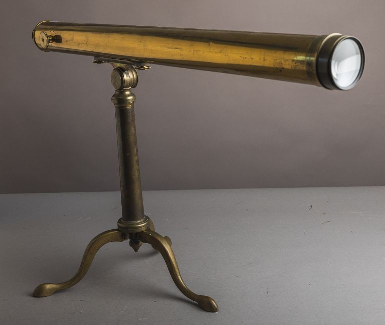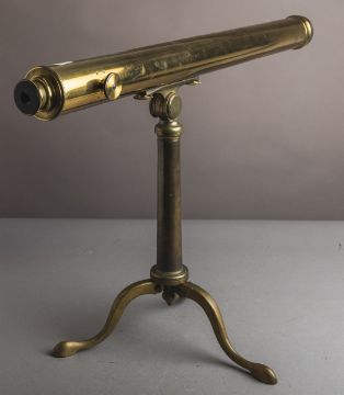 Fernrohr auf Stativ (Ende 19. Jh.), Messing, ausfahrbar, auf Cabriole-Beinen, mit gravierter Herstellerangabe „L'ING CHEVALLIER, OPTICIEN, Place du Pont Neuf 15, Paris“. Gr. ca. H: 52 cm (m. Stativ), L: 85 cm (Fernrohr eingefahren).