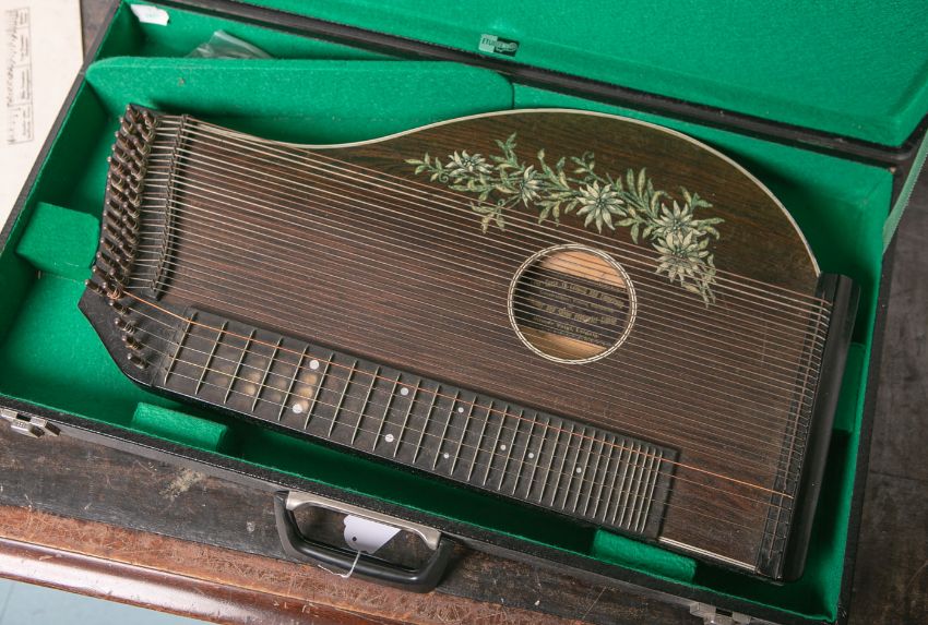 u. Umgebung-Conzertzither, Violine u. Mandoline", m. 32 Saiten, Zitterkorpus m. Blumendekor, m. Orig.-Schlüssel f. Koffer, anbei "Abbildung einer Zither m. 35 Saiten", L. (Zitter) ca. 56 cm. Gebrauchszustand.