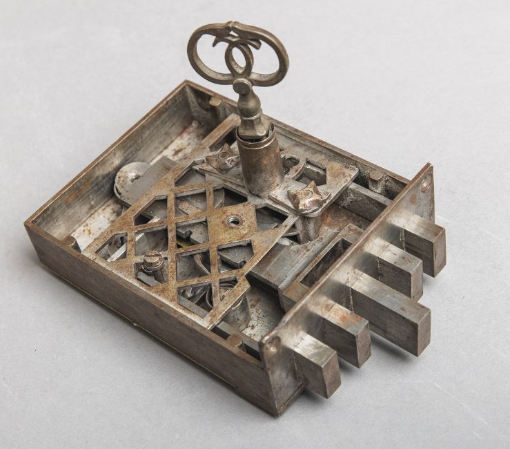 fein gearb. m. Darst. zweier einander gegenüberstehender Löwen, mittig Monogramm "TB", teils graviert, m. sehr ausgefallenem Schlüssel, Gr. ca. 14 × 11 cm. Sehr schöner Zustand. Aus rheinischer Privatsammlung (W. Kirchgesser, Köln).
