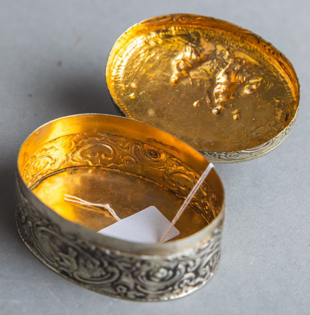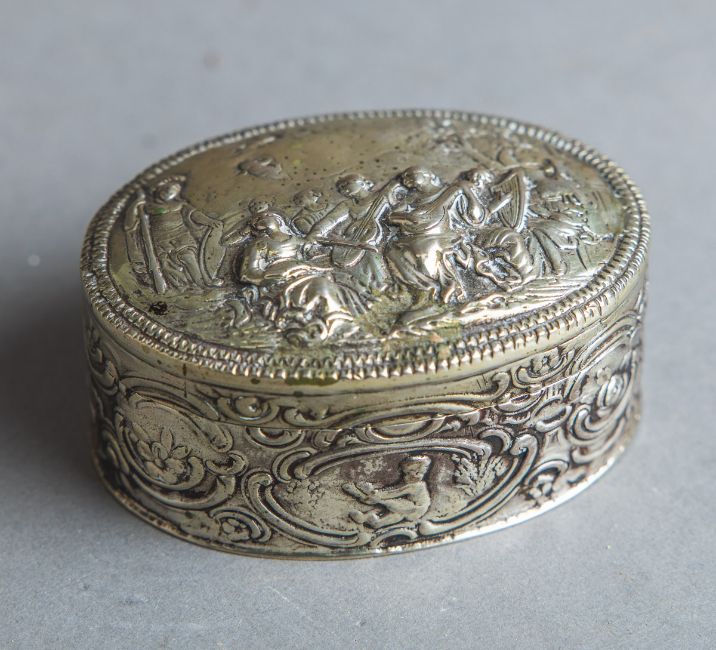Musikinstrumenten, Rand rundum m. Rocaille- u. Putti-Dekor, Innenseite vergoldet, gestempelt, Gr. ca. 8 x 6 x 4 cm, Gew. ca. 105 g.
