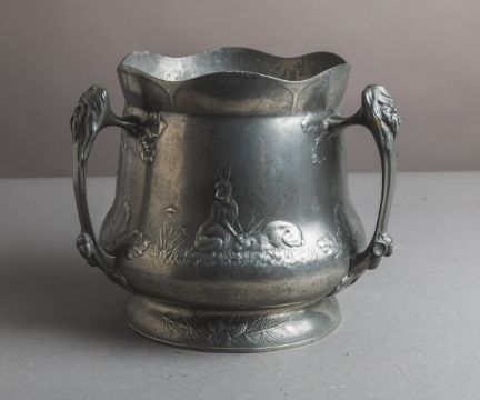 Rotwild m. dreizinkigem Geweih, Eichenlaub, Hasen u. einem Fuchs, welcher einen Wildvogel gefangen hat, Unterbodenmarke m. Nr. "27" u. "4318", H. ca. 24 cm, Dm. d. Öffnung ca. 21 cm.