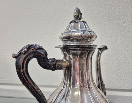 Große Silber-Mokkakanne (wohl 1. Hälfte 19. Jh.), bauchige Gefäßform, hoher Ausguss im